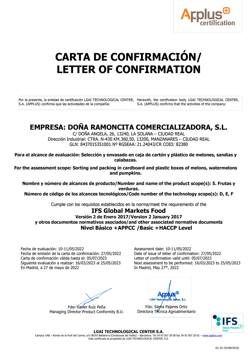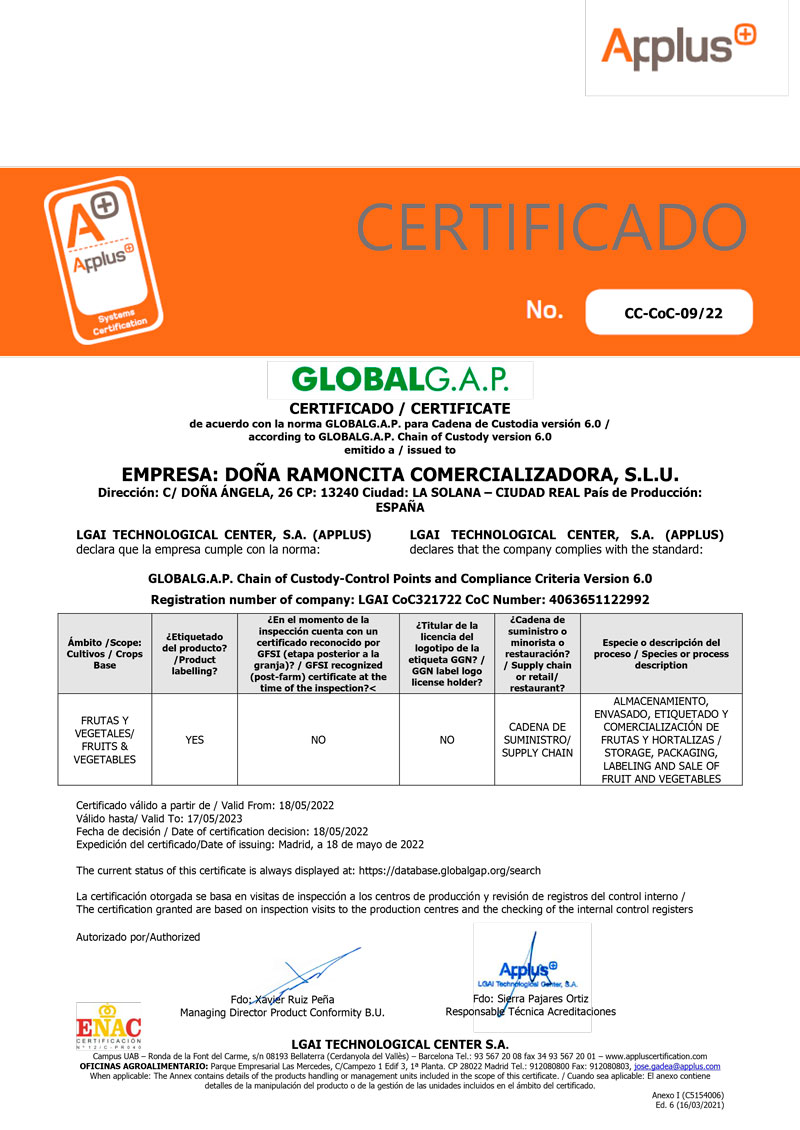 La dirección de DOÑA RAMONCITA COMERCIALIZADORA, S.L.U. considera primordial el desarrollo, en todos los niveles de su organización, de un Sistema de Gestión de la Calidad, y Seguridad Alimentaria, basado los Protocolos de Seguridad Alimentaria IFS y GLOBAL GAP, con el fin de certificar la producción segura de nuestros productos, cumpliendo con los requisitos legales y reglamentarios que son de aplicación en nuestras actividades de clasificado y envasado de productos hortofrutícolas, en cajas de cartón y plástico, y con los establecidos por el cliente, y de otros requisitos que la organización suscriba.